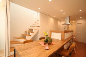 間口5m、奥行28mの細長い土地の形状を「ほかにはない」個性に変えたプランニングが見どころの二世帯住宅です。 踊りの稽古場やセカンドリビング、扉の向こうにはワクワクするような空間が。