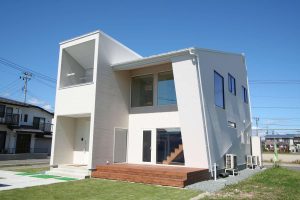 特徴的な外観と、視線が気にならない中庭ウッドデッキから吹き抜けのある玄関へ。 ご主人様の書斎スペースと、2階リビングならではの大きな窓からは存分に岩手山を眺められるよう眺望も意識しながらの建物まさにドリームハウスです。