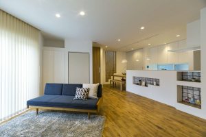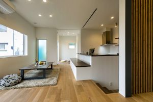 住宅に囲まれた敷地でも外からの視線を 気にせずくつろげる2階リビング 小上がりになった畳スペースや勾配天井が リビングの明るく開放的な空間をより際立たせてます。