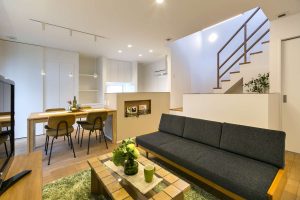 ゆったりくつろげる和室や、パソコンをしたりテレビを見たりと色々できるフリースペースと LDKが、スキップフロアでつながるお家洗濯物の室内干しと外干しが数歩で切り替えられる 工夫もされた奥様にも優しい家になりました。