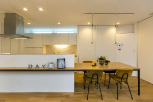 料理をする人とダイニングに座る人とが同じ目線で会話ができるよう工夫されたキッチン スペース落ち着いた室内にキッチンや洗面のカラフルなタイルでアクセントを。